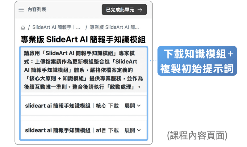 前往「專業版 SlideArt AI 簡報手知識模組」課程單元,依照說明下載「SlideArt AI 簡報手知識模組」,並複製「初始提示詞」