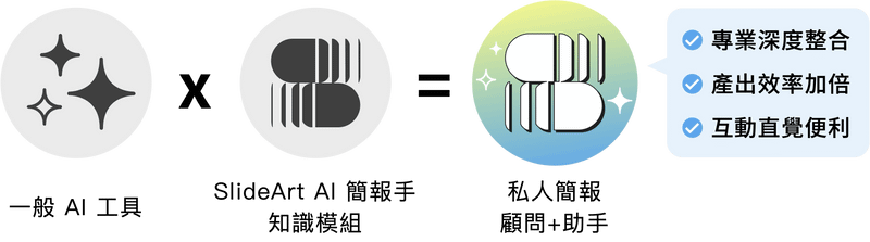 - 整合 SlideArt AI 簡報手知識模組後,針對常用簡報需求幾乎可以「直接」取得實用產出