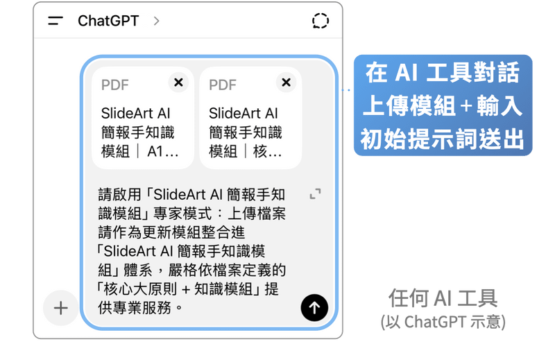 將「SlideArt AI 簡報手知識模組」上傳至 AI 對話+輸入初始提示詞後送出,即可開始使用!